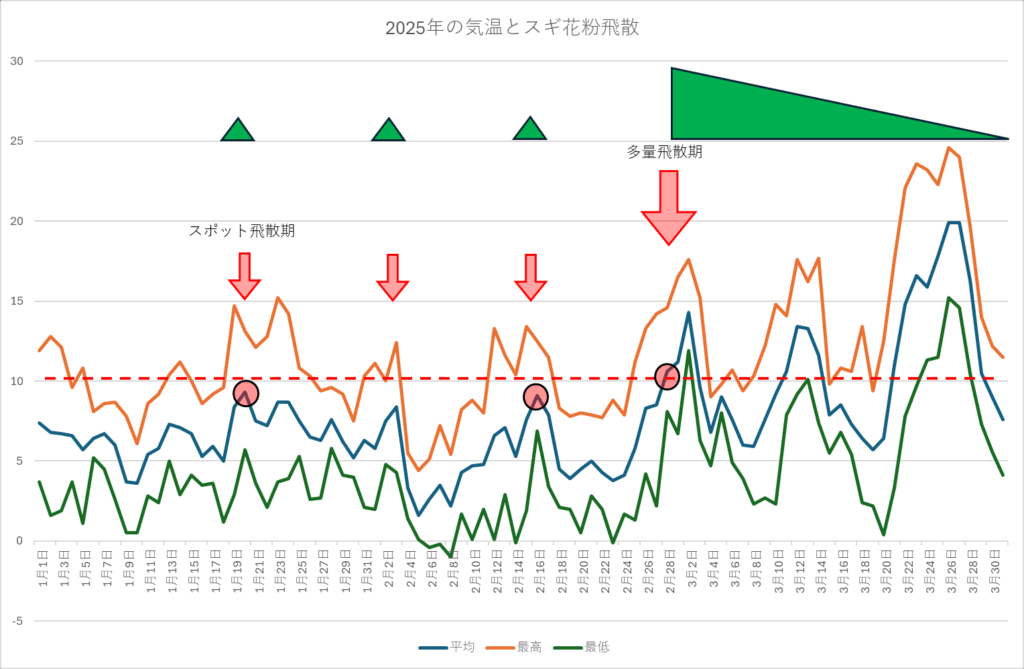 ただ、当院は、10年間和歌山市の花粉観測を実施してきましたので、スギ花粉がどのような状況で飛散するか、だいたい予想できており、ここ数年は気候変動の影響で、12~1月が若干生暖かく、本来暖かくなる2月中旬がとても寒くなり、3月に暖かくなるという状況が続いており、スギ花粉が12月~1月に少しだけ飛散し、その後2月にピタッと止み、3月に入って、ヒノキと一緒になって爆発的に飛び出すという状況が続いていますので、12月に舌下免疫を開始するのは、あまりお勧めできません。
